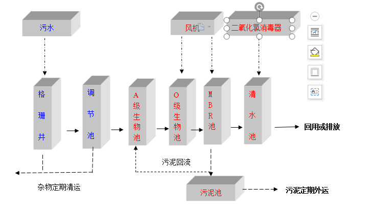 污水由排水系统收集后,进入污水处理站的格栅井,去除颗粒杂物后,进入调节池,进行均质均量,调节池中设置液位控制器,再经液位控制仪传递信号,由提升泵送至A级生物接触氧化池,进行酸化水解和硝化反硝化,降低有机物浓度,去除部分氨氮,然后入流O级生物接触氧化池进行好氧生化反应,O级生物池分为两级,在此绝大部分有机污染物通过生物氧化、吸附得以降解,出水经MBR膜过滤后自流至二沉池进行固液分离,沉淀池上清液经二氧化氯消毒后回用或排放。